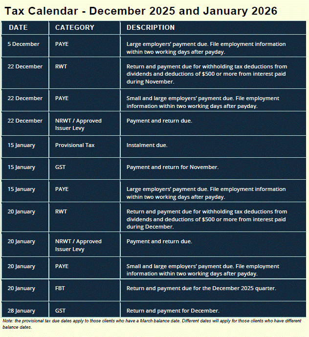 The 15 January due dates for PAYE, GST, and provisional tax can feel like a Grinchy surprise. Set aside funds now to avoid starting the new year under pressure.